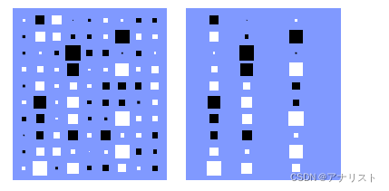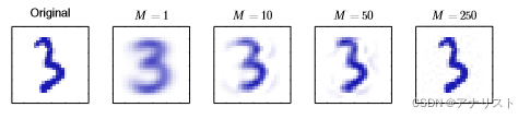 图中矩阵每个元素用一个方形表示,其中白色是正值,黑色是负值,其面积正比于元素的大小。合成数据集包括D=10维的300个数据点,这些数据点是从高斯分布中采样的,对于这10维中的数据集,在3个方向上标准差为 1.0,其余7个方向上的标准差为 0.5,也就是说M=3个方向的方差大于 剩下7个方向。左图是最大似然PPCA的结果,右图是贝叶斯PCA的结果。我们看到贝叶斯模型能够通过抑制6个剩余自由度从而发现恰当的维度。