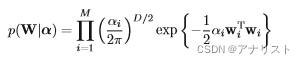 这里介绍一个更简单的方法,基于证据近似(evidence approximation),当数据点个数较多,对应的后验分布的峰值较高的时候,该方法比较合适。它包含对W指定的先验选择,并允许主子空间中过剩维度被修剪掉。这对应了一种技术叫自动相关性确定(automatic relevance determination或ARD)。具体来说,我们基于W每列定义独立高斯先验分布,它表示主子空间的向量。每个高斯有个独立的方差,它由超参数精确控制,具体如下: