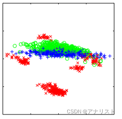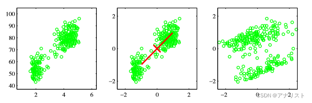 其中紫色的直线表示低维子空间,红色的数据点正交投影到该子空间,得到绿色的点,其中需要满足方差最大化原则。而PCA另一个可选的定义是,最小化二次投影误差之和,如蓝色的线段所示。
