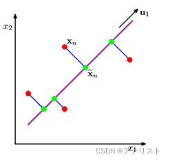 ,就能得到一个无意义的最小化结果。这个约束来自正交条件,而最终问题的解将用协方差矩阵的特征向量的扩展来表达。在正式求解之前,首先让我们获取一个直觉,考虑一个2维数据空间(D=2),以及一个1维主子空间的场景(M=1)。我们需要寻找一个方向