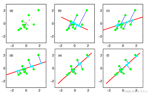 需要指出这些都能用在线方式实现。并且这些公式理解也很简单,在E步包含数据点到主子空间的正交投影,M步包含对主子空间的重新估计,为的是最小化二次重构误差。我们可以给出EM的物理类比,特别当D=2以及M=1时,就能简单可视化。在二维数据点集合中,让一维主子空间用实线表示,让数据点附着到线段上,在E步中保持线段固定,允许数据点上下滑动。这会导致数据点在正交投影方向有独立的位置。在M步中保持点固定,让线段滑动到最优的位置。E步和M步不断重复直到收敛条件的满足,如图8所示。