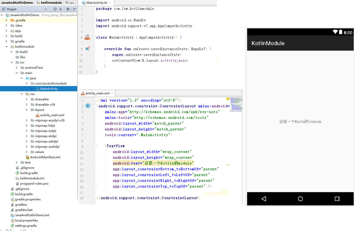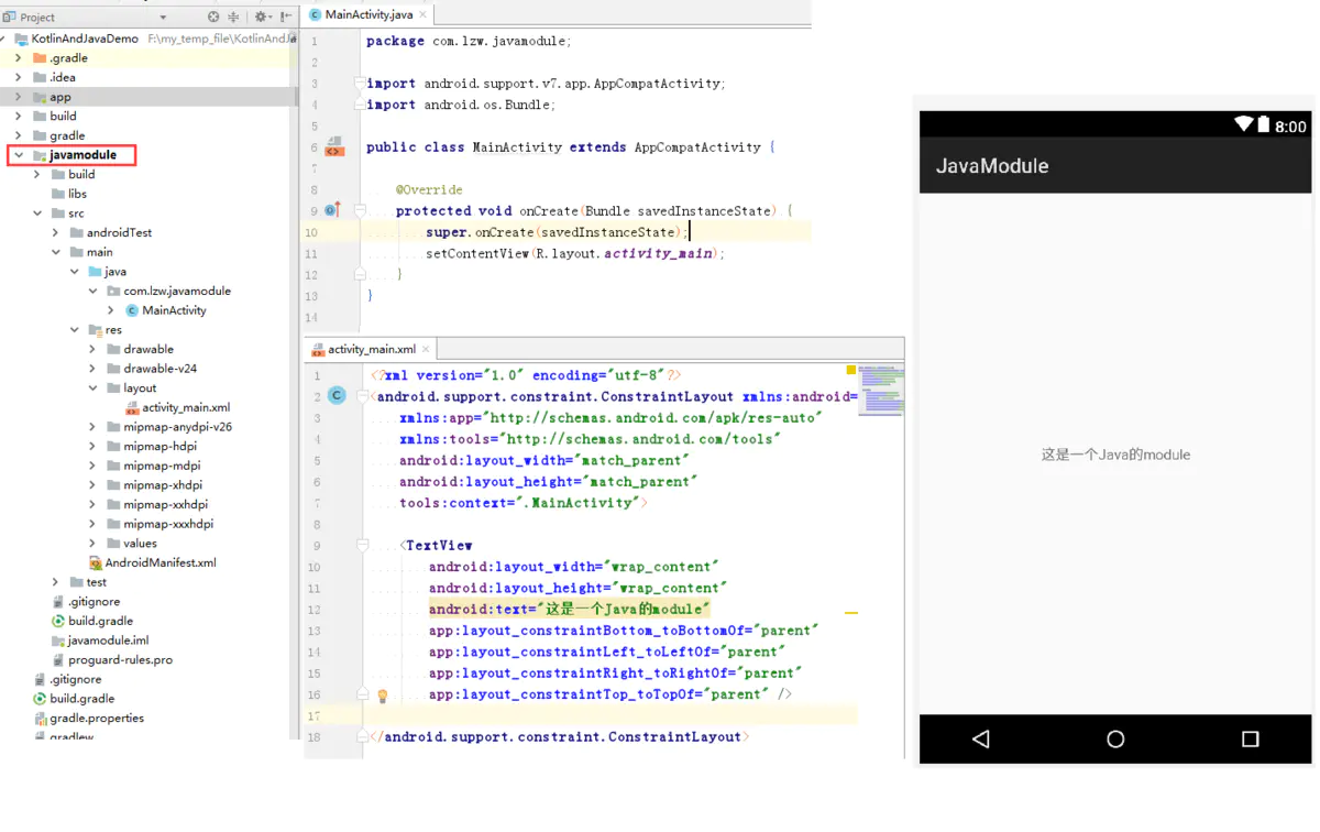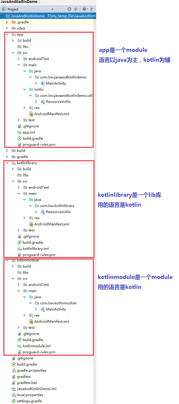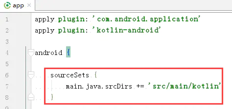 我们还是拿第一个前面的工程KotlinAndJavaDemo为例,我在moduleapp里面同时使用kotlin和java两种语言做开发。 为了便于区分,需要在该module的build.gradle文件做配置。