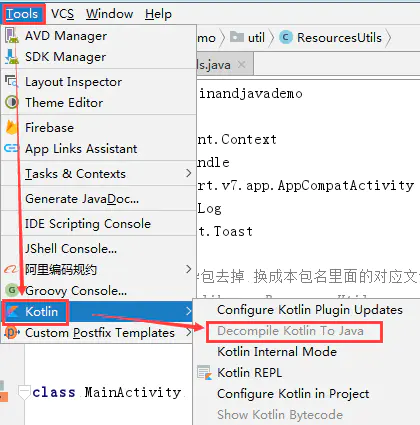 3.Tools --> kotlin --> Decompiler Kotlin to Java,如果该选项是灰色,请下载插件