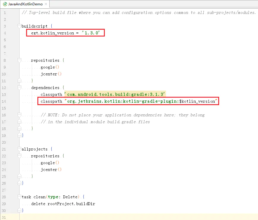2.在工程根目录 build.gradle 的buildscript节点 配置kotlin版本号: