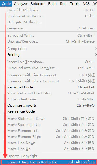Code-->Convert Java File to Kotlin File,即可把java文件转换成kotlin文件。