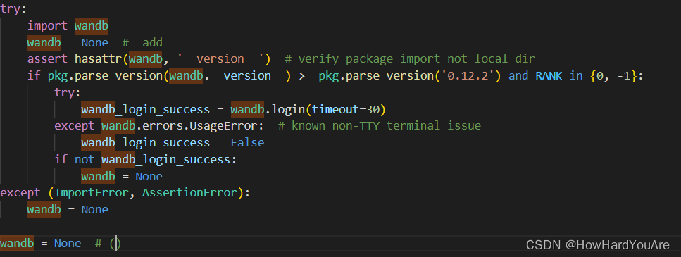 首先,打开utils/loggers下的__init__.py文件,在import wandb下增加一行代码wandb=None