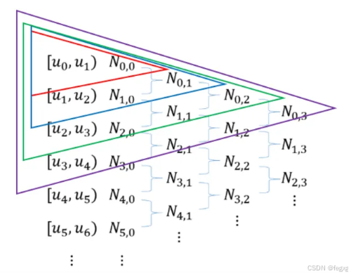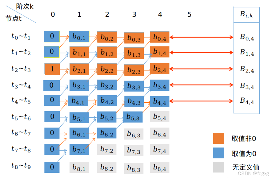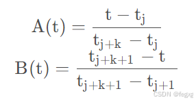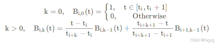 当我们值得t时,可以通过Dedoor公式进行递推计算系数(基函数Bi,k):