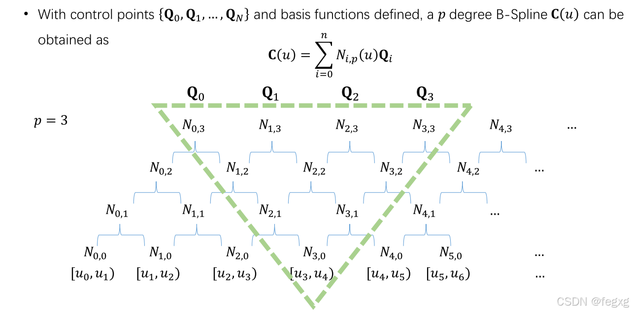 同样,我们可以看出,当t∈[t4,t5]时,Bi,4都是非零值,则说明该区间的点是由基函数完全定义(基函数和控制点的加权和,没有哪一项基函数为0)。一般性的,t的范围为[tpb,tm-pb],而不是[t0,tm]。
