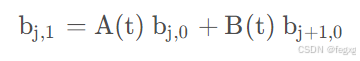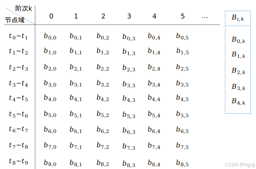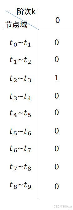 第一列的值规定,当t落在[tj,tj+1]时,对应该区间的bi,0值为1,其余值为0,如: