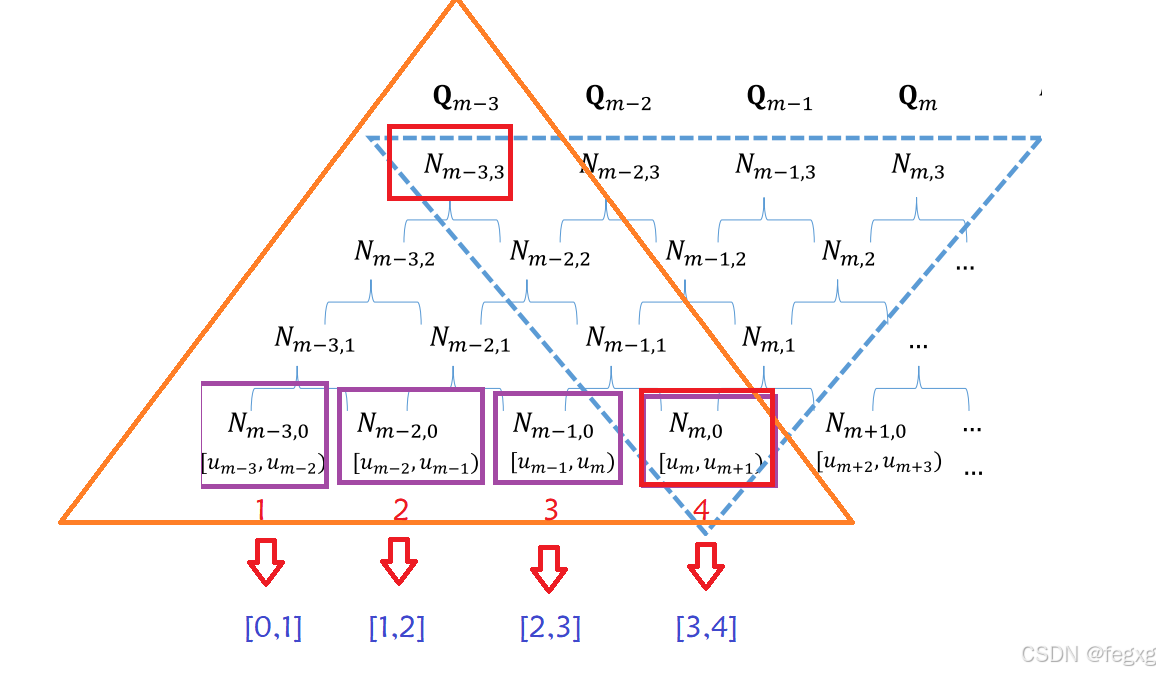 由前面的内容可以知道,[tj,tj+1]时间段对应的控制点为Qm-pb到Qm,而控制点控制点Qj对应的影响区间为[tj,tj+pb+1],则如图所示: