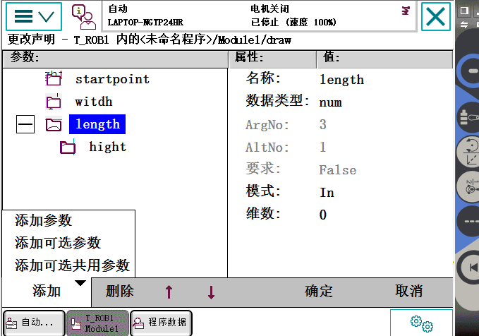 如果在示教器中建立例行程序时,可以按下图添加参数,其中互斥参数就是选择“添加可选公用参数”。