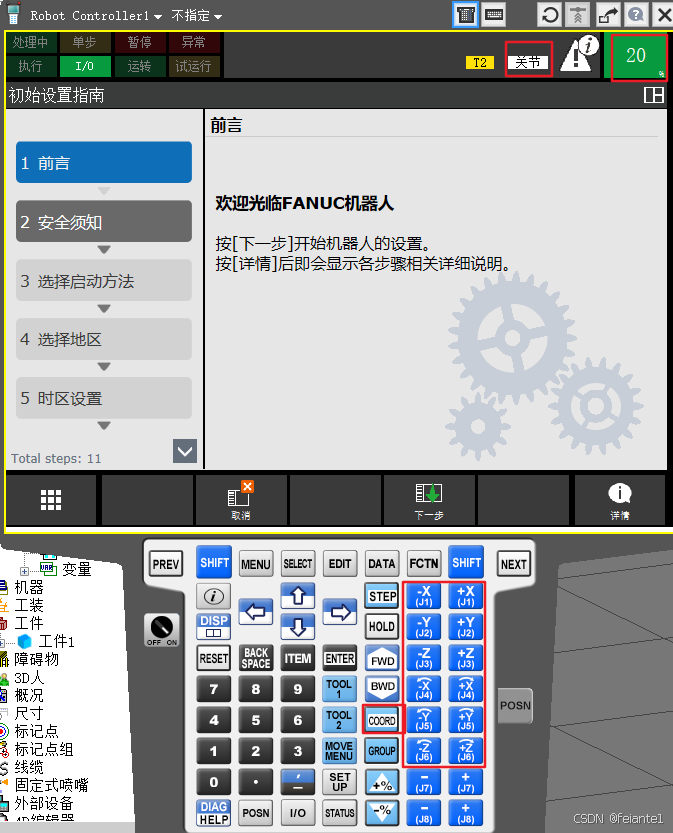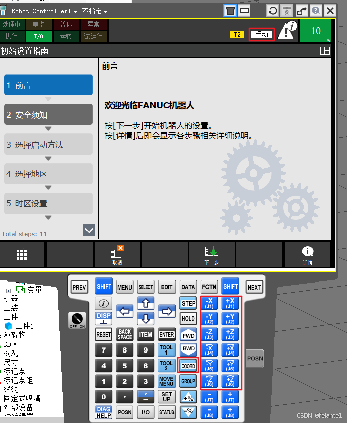 通过COORD按键,选择运动模式为手动,通过+X,-X,+Y,-Y,+Z,-Z控制机器人线性运动和绕轴旋转。
