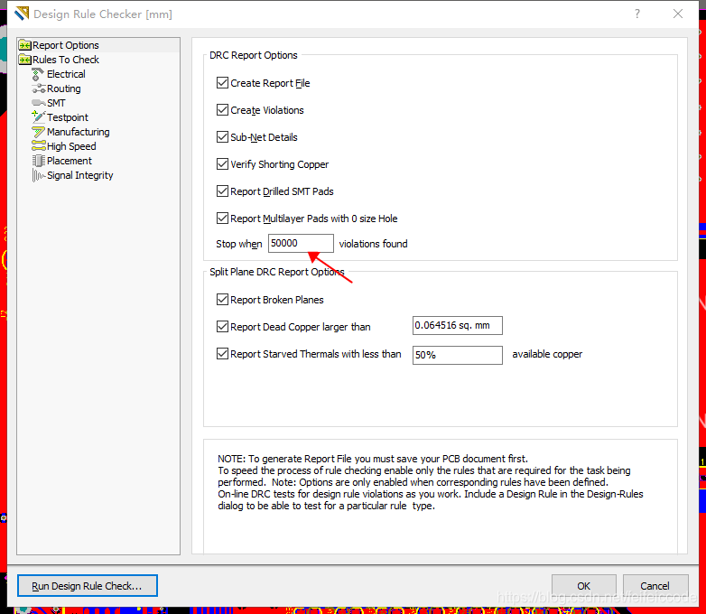2》需要在DRC检测之前要设为最大的检测数为最大值,也就是说让你的所有错误都可以检测出来,这样就可以把没有显示的未连线的信息爆出来。之前设置的只设置了最大500个造成的。改为50000个就好了