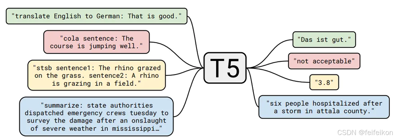 T5将自然语言处理任务都转化成几乎一致的格式,即输入是带有任务前缀声明的文本序列,输出的文本序列是相应任务的结果。其输入格式和输出格式类似于GPT-3在Few-shot Learning设置下的格式。