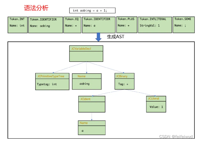 语法分析是根据Token流来构建抽象语法树的过程。抽象语法树(AST)是一种用来描述程序代码语法结构的树形表示方式,语法树的每一个节点都代表者程序代码中的一个语法结构,比如包、类型、修饰符、运算符、接口、返回值甚至连代码注释都可以是一个语法结构。