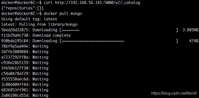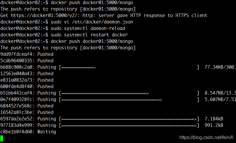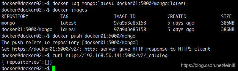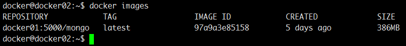 docker02 -> ip:192.168.56.142 -> docker pull mongo -> docker tag mongo:latest docker01:5000/mongo:latest -> docker push docker01:5000/mongo
