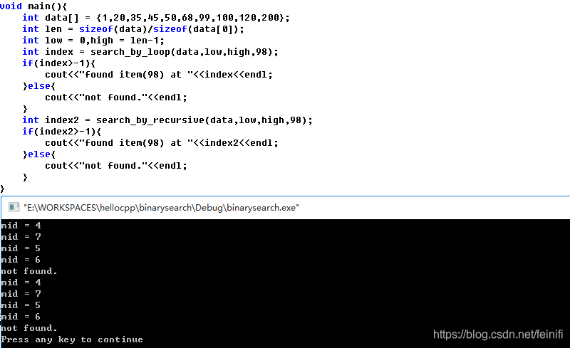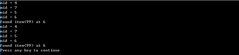二分查找的思路很特别,就是不断的从原始数组中进行范围缩小式的查找,基于这种原理,二分查找算法的实现可以使用循环的方式实现,也可以使用递归的方式实现。关键点是计算中间下标,以及算法终止的条件。中间下标计算方式:mid=(low+high)/2,最开始low=0,high=size(array)-1,之后根据比较结果,low或者high会发生变化。终止条件low>high。根据这些思路,我们给出二分查找的示例代码: