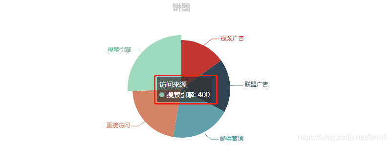 我们可以通过tooltip属性来设置提示信息,提示信息默认有一个格式化属性formatter,如果我们什么都不填写,就是"{a}<br/>{b}:{c}",我们可以自定义,但是一般来说都逃不过{a},{b},{c}这些占位符代表的数据,一般而言,{a}代表series中的name属性值,而{c}代表series中的data对应的具体值,{b}根据不同的图形代表的值不一样,饼图中{b}代表series中data中的name,在有坐标的图中,表示横坐标的下标值xAxis->data[i]。如下所示:什么都不填写的情况下,饼图的tooltip: