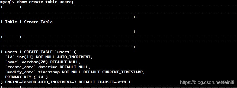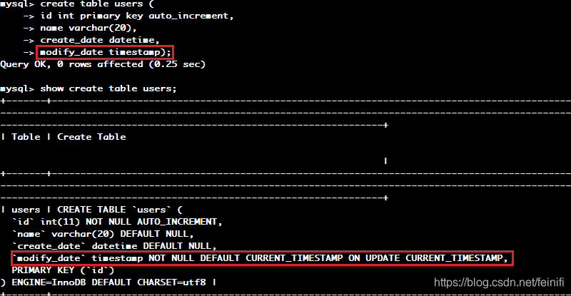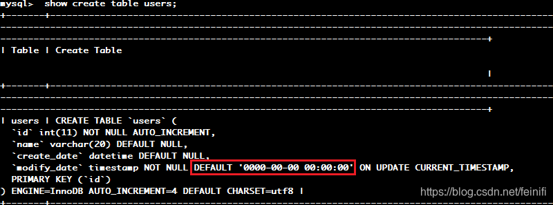 默认情况下,我们设置modify_date的时候,就只是指定了timestamp,并没有后面的设置默认值,并在修改的时候指定当前时间。但是我们通过show create table users查看的 sql语句来看,他出现了是指默认值,以及修改记录的时候会刷新。