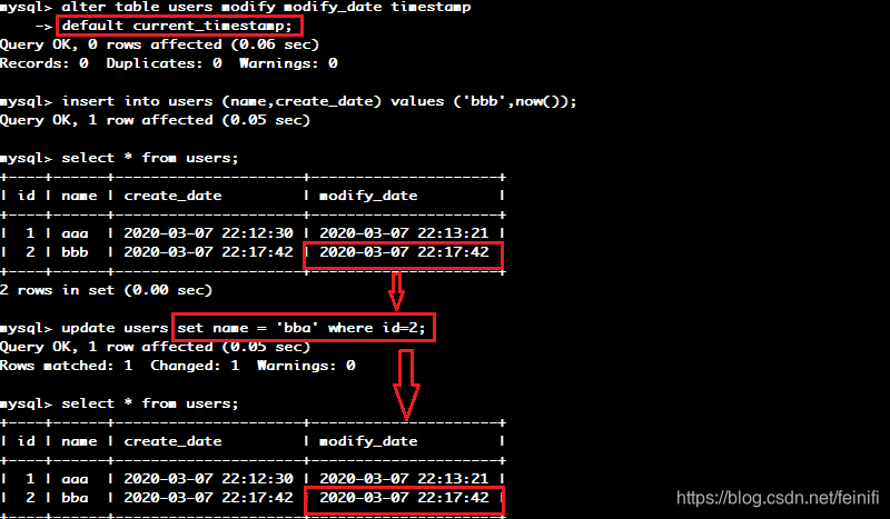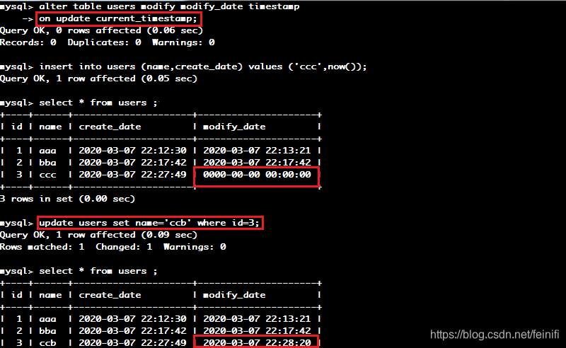 mysql> update users set name='aaaa',create_date='2020-03-07 22:57:30',modify_date='2020-03-07 22:57:00';