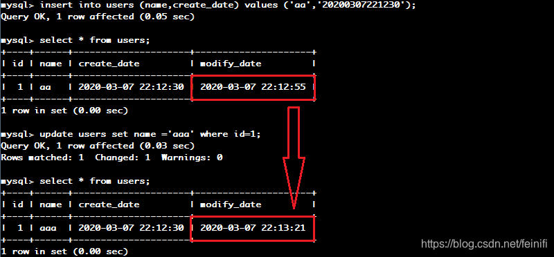 mysql> update users set name='aaaa',create_date='20200307225730',modify_date=20200307225700;