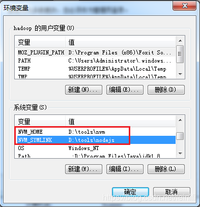 我们需要在环境变量中,新增两个变量,分别是NVM_HOME,NVM_SYMLINK,分别指向nvm安装目录以及nodejs将来安装目录,其实这两个变量分别对应第二步中settings.txt配置文件的root和path的值。