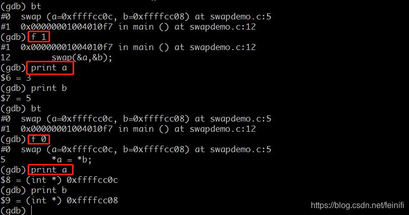 | frame | 切换栈帧,后面跟栈序号,通常与backtrace配合使用,先查看,再切换 | 简写f |