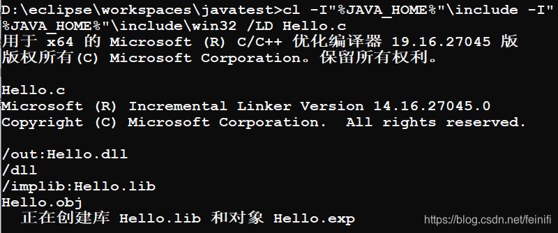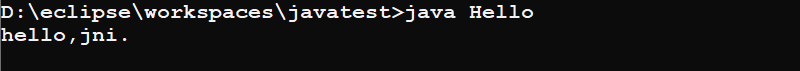 可以通过命令cl编译动态链接库,生成Hello.dll,接着可以运行java Hello,打印hello,jni。如下所示: