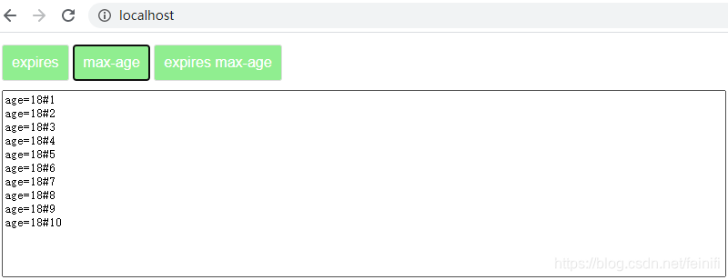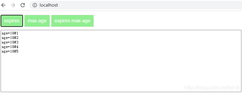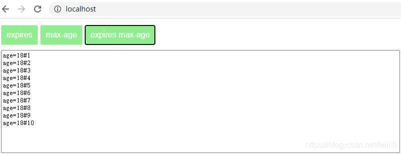 页面上有三个按钮,依次点击,看效果:过期时间设置的是5秒,最大生命周期设置的是10秒,单独设置,各自生效,一起设置max-age生效。