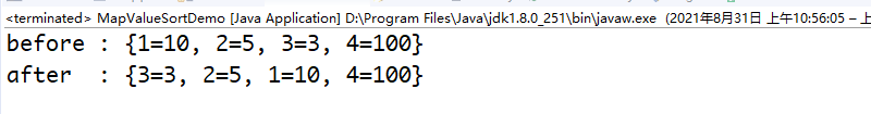 System.out.println("after : "+map); // {<3:3>,<2:5>,<1:10>,<4:100>}