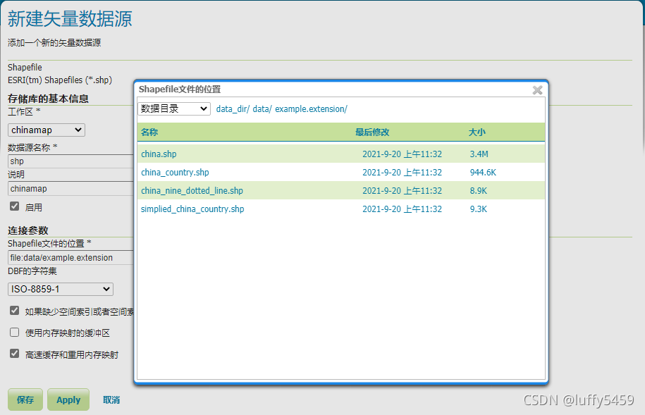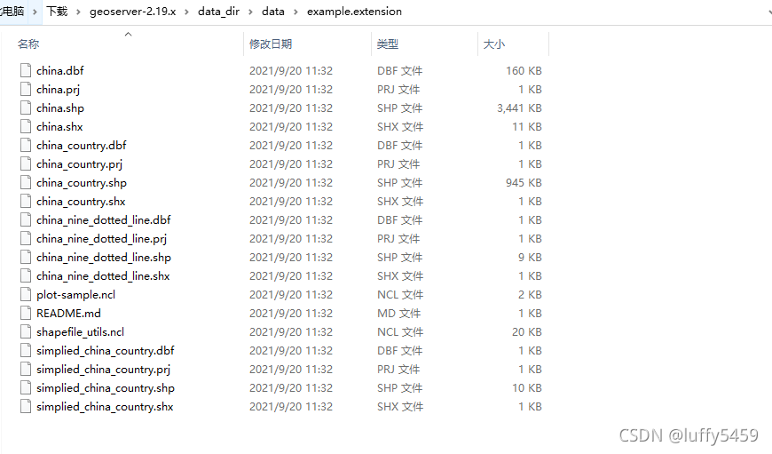 准备工作是我们需要shp文件,里面包含了地图信息,这给出一个gitee地址,上面有中国地图信息以及九段线等四组shp文件。将下载后的文件全部提取出来,放在geoserver安装目录下的data_dir/data/example.extension目录下,这一步是为了后面操作更方便。