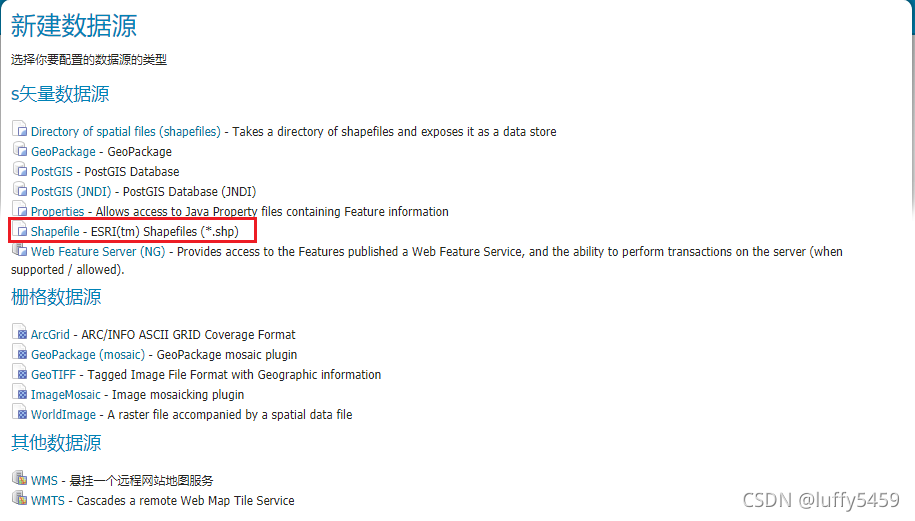 2、点击“数据存储”菜单,添加新的数据存储,选择Shapefile类型: