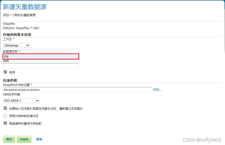 在这里,Shapefile文件所在的位置,默认就是data/example.extension目录,所以前面的准备工作把shp文件放到example.extension目录就省了一些事情,我们点击浏览,这时候会直接加载shp文件。