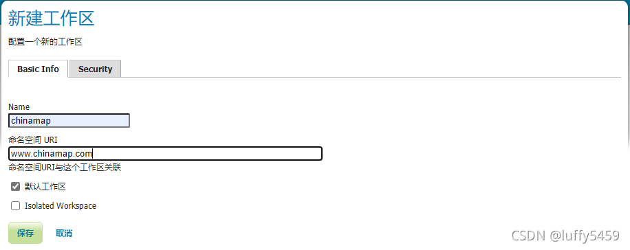 添加工作空间页面,两个字段必填,这里填的是chinamap,www.chinamap.com,你可以根据需要随便填写。