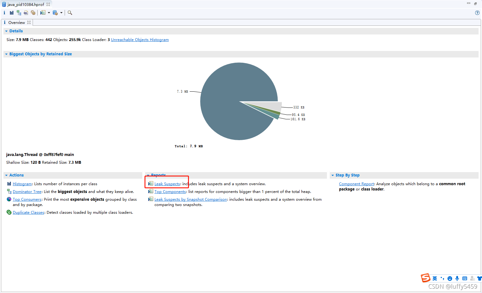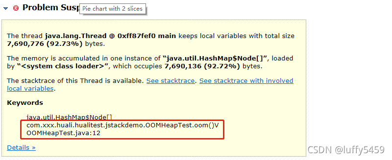 点击Leak Suspects链接,我们可以跳转到它的概览页面,这里就可以看到具体的报错位置: