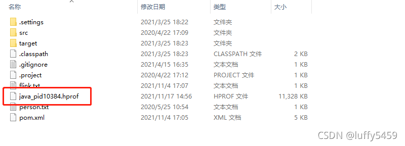 如上图所示,因为内存溢出报错程序结束,产生的堆栈转储文件在项目目录下,文件名是java_pid10384.hprof。