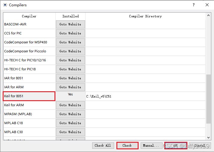 但是可以点击后面的Compilers配置界面:在这里,下拉到Keil for 8051的时候,Compiler Directory为空,Installed显示的是Goto Website,可以选中该选项,然后点击"Check"按钮,自动识别系统中安装的Keil目录。