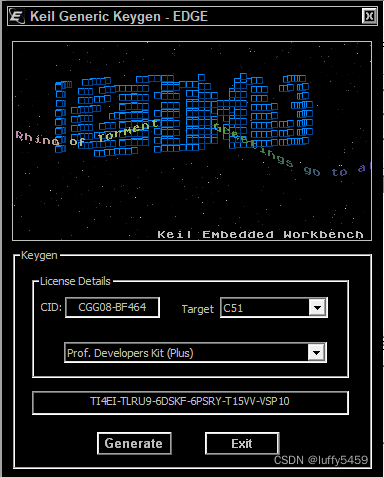 破解keil需要使用管理员权限启动keil,然后点击File->License Management,在打开的面板中复制computer id,也就是cid,然后同样以管理员权限打开注册机(这玩意很吵),在cid的位置,粘贴上复制过来的cid,Target默认应该是C51,也就是对应开发51单片机的注册码,最后点击"Generate"按钮会生成一个注册码。