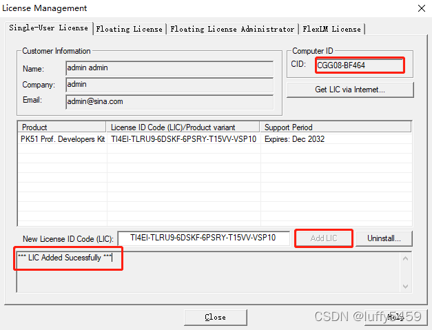 同样复制这个注册码到keil license management界面 ,粘贴到New License ID Code (LIC)输入框中,然后后面的"Add LIC"按钮变为可点击,点击最后显示LIC Added Successfully表示添加成功,可以看看最后的失效时间,不出意外的话就是2032年,够用了。