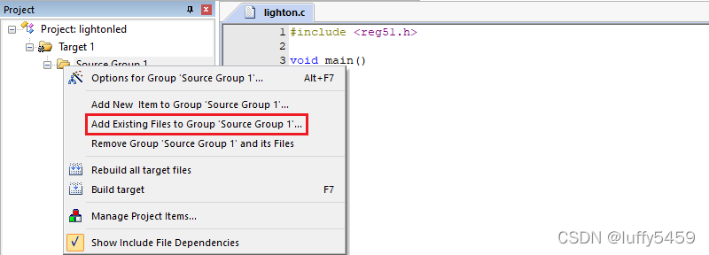 工程中没有别的内容,需要新建文件,然后保存为.c结尾的格式,然后还需要在项目源码(Source Group1)上右键选择添加已有文件(Add Existing Files to Group 'Source Group1'):