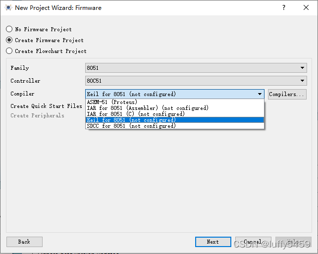 经过我个人的摸索,在keil与proteus联调的过程中,其实都可以不用打开keil,在proteus中新建工程的时候,选择按照硬件类型构建,然后选择Family 8051,Controller:80C51或者80C52,最后选择编译器类型,这时候如果是先安装proteus,可能不会发现系统中的keil编译环境: