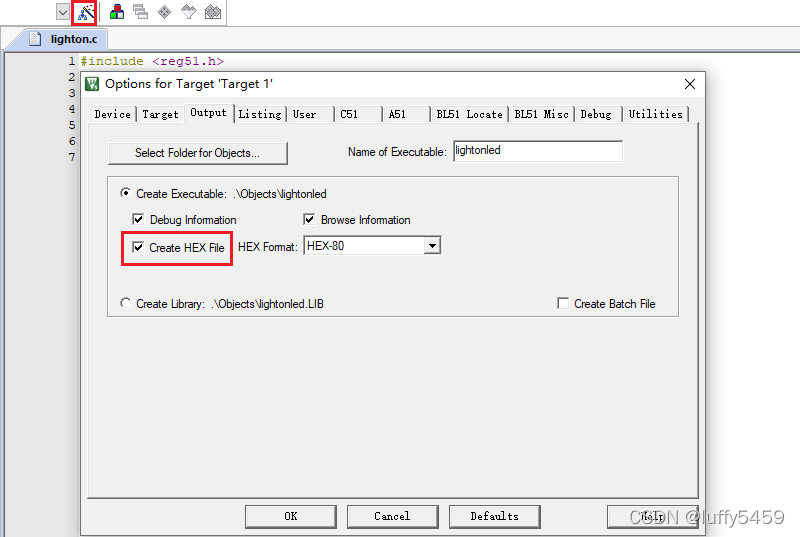 在弹出的面板中选择Output标签页,选中Create HEX File复选框即可。
