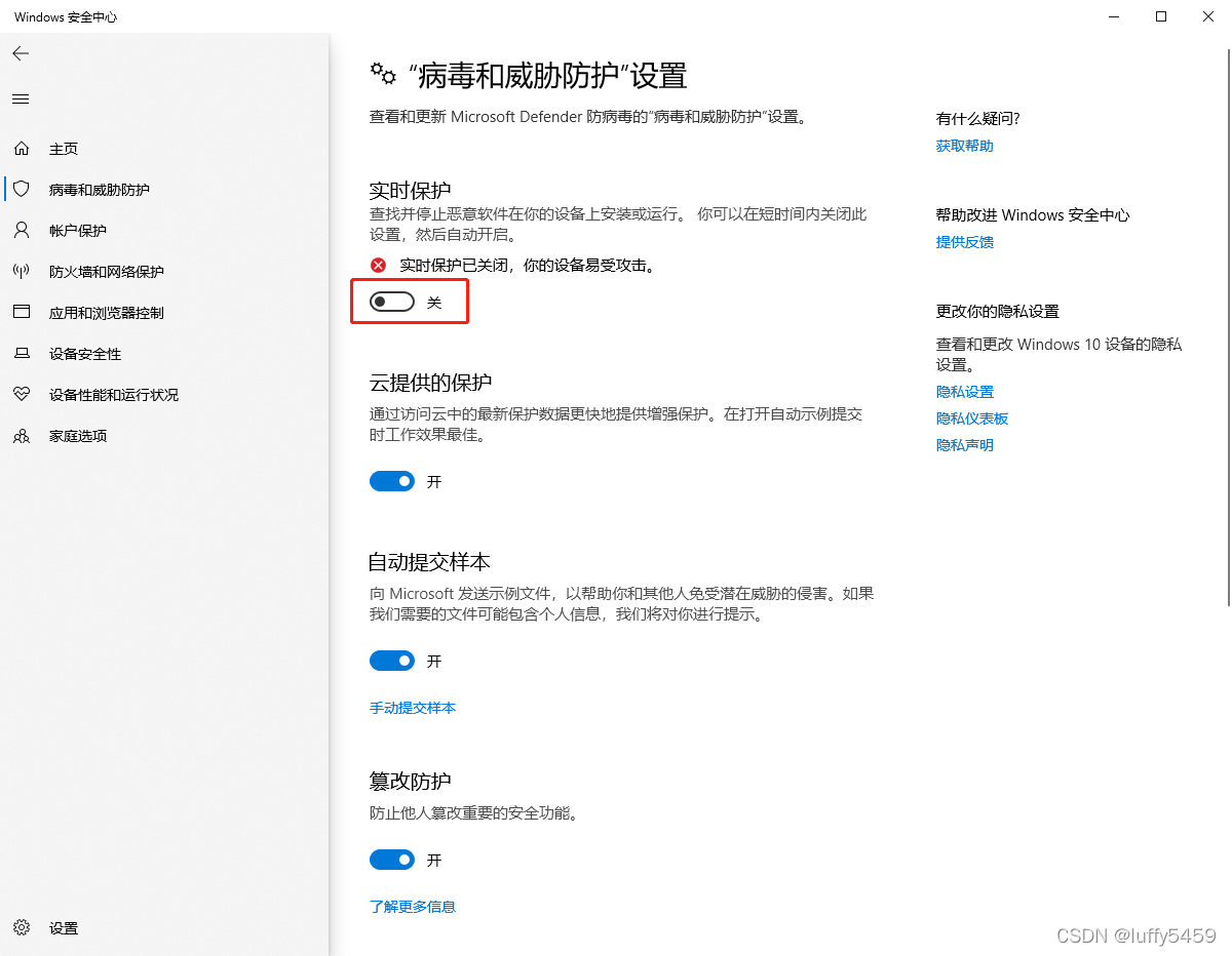如果是win10,记得一定要关闭windows安全中心,“病毒和威胁防护”设置下的实时保护: