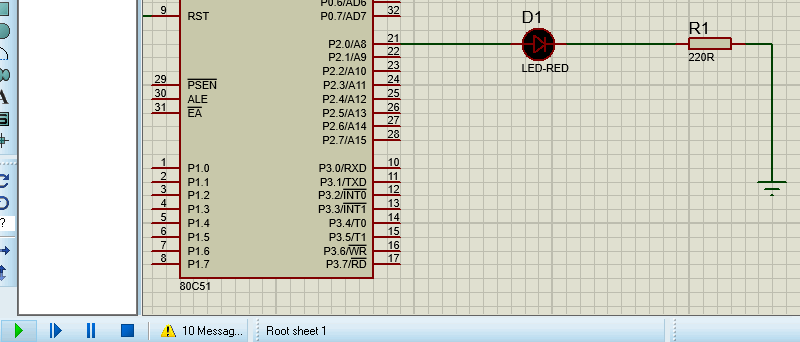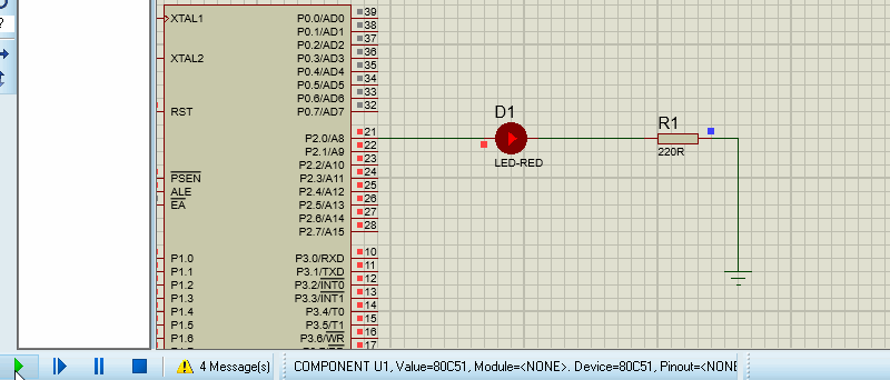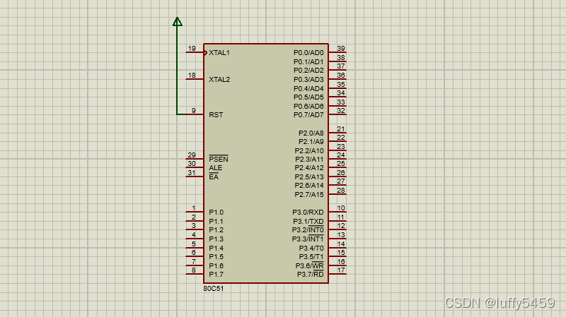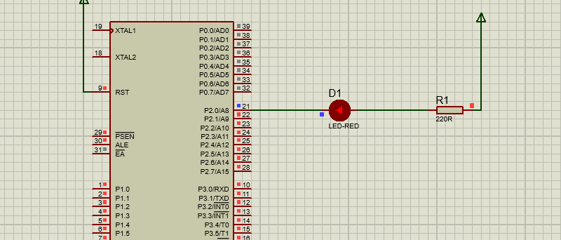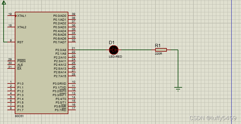 值得注意的是,我开始在选择引脚接线的时候,直接接到P0管脚,后来发现死活点不亮二极管,仿真也不报错,后来发现接到P2管脚,立马就点亮了,而且在观察实验现象的时候,发现P0管脚根本没有任何变化,其他的P1,P2,P3都会显示红色,P2接二极管的管脚P2.0时不时还显示蓝色,从这里可以看出,P0管脚没有参与电平输出。所以接线的时候还是要注意一点。