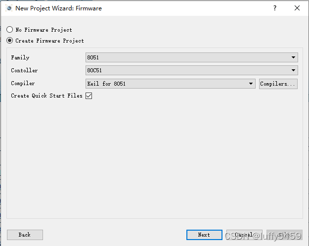 这一步选择 “创建硬件项目”,英文版是:Create Firmware Project。Family选择8051,Controller选择80C51,编译器选择Keil for 8051,如果显示not configured,需要自己配置。