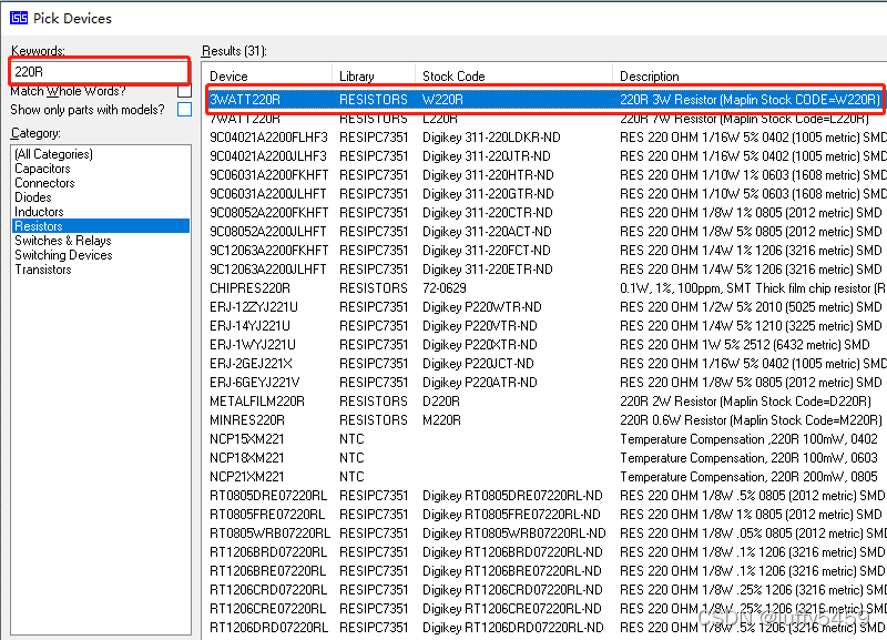 出现如下所示的弹出框:在关键字输入框,分别输入LED-RED,220R分别选择右侧的二极管和220欧姆电阻。最后点击页面下方“ok”结束选择元器件。