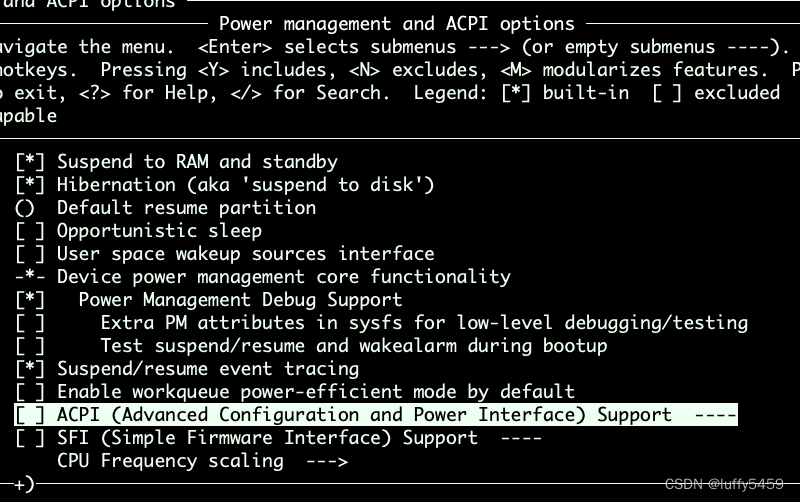 最后,根据网上的一些提示,如果在编译linux内核的时候,在电源管理这里,取消对acpi的支持,最后保存配置,编译生成镜像成功,也是可以的。