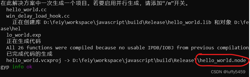 这里我们通过require引入的是hello_world.node模块,他是通过node-gyp build生成的。