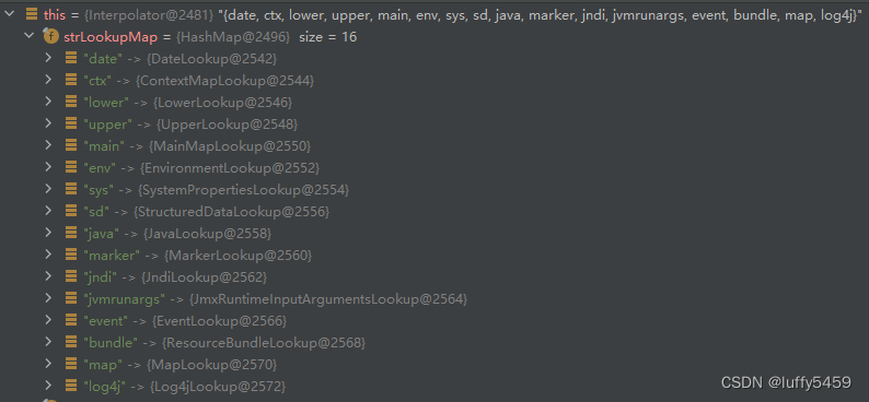 从上面的打印结果来看,我们在客户端里面其实就是想输出日志,但是我们通过一些表达式,比如:LOGGER.error("hello,{}","${jndi:rmi://localhost:1099/evil}")来拼接日志信息,日志会进行格式化,在格式化的时候,会查找一些lookup,这里面有如下的lookup: