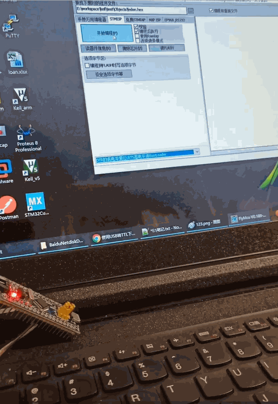 这里下载程序是正常的,所以操作可能看不出什么问题,但是有时候,点击开始编程,单片机并没有下载程序,FlyMcu工具里面显示一直在连接中,最后失败。这种硬件问题排查,非常痛苦,因为我们不确定哪里完全没问题,只能不断检查这个设置,那个配置。我这里也出现过这样的问题。我开始怀疑是串口线接错了,但是反复确认,不是线接错了。又怀疑BOOT0,BOOT1跳线帽设置错误,反复更改,之后还按下reset按键,依旧没有改变。最后又把问题转到FlyMcu工具的设置上,其实这里面唯一可能出错的就是DTR,RTS电平设置 下拉选择。最后,把问题放在了单片机排针上,我本来是用了排针,但是没有焊接每一个针脚,只是让他固定住就行了,3后来卸下排针,直接用公母杜邦线连接A9,A10,竟然烧录成功,而且程序运行正常。最后又把排针装上,把A9,A10口焊接,再次验证,又烧录成功了,这次的教训就是排针有可能也是不导通的,虽然插入了对应的电路板孔中。